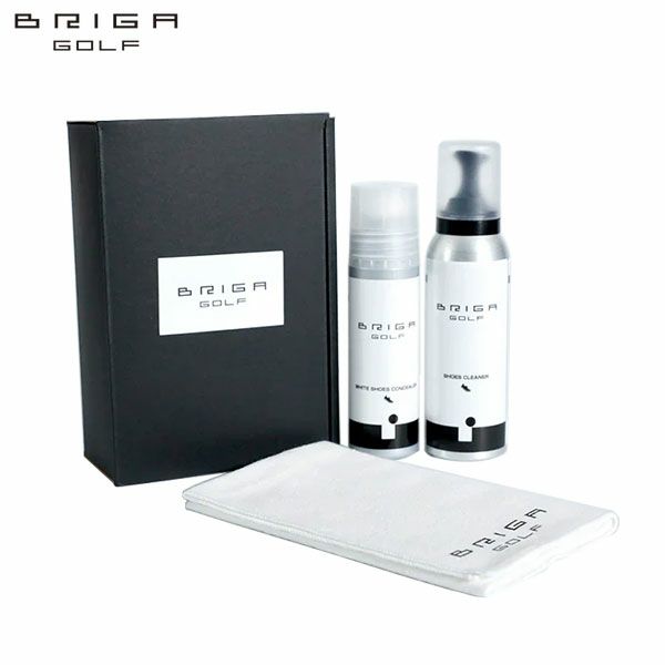 ゴルフシューズを手軽にクリーニングする高密度フォームクリーナーと、白いシューズの気になるキズ・シワの奥に入り込んで落ちない汚れを隠す白革用コンシーラー、専用クロスのセット。
