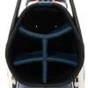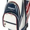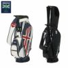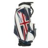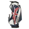 キャスター付きのキャディバッグ。エナメル生地を使用。大きいユニオンジャッグがデザインポイント。キャスター付きとなっており、背面にはキャリーハンドルがある為、運ぶ際も簡単。キャリーハンドルも使用する際、手に干渉しにくいようにハンドルがカーブしている設計となっている。口枠9型5分割、セパレーター3分割。