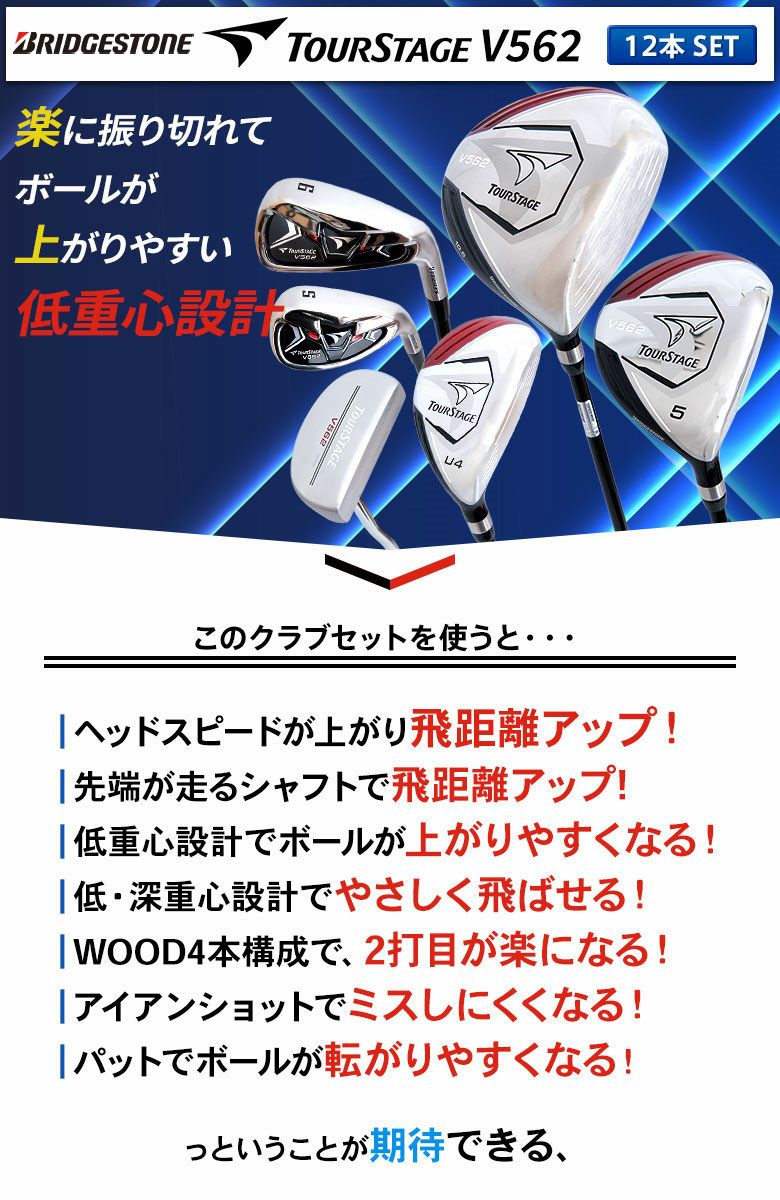 他の画像を見る ☆即日出荷☆ [レビュー投稿で保証延長]【クラブセットのみ】ブリヂストン ゴルフ ツアーステージ V562 クラブセット 12本組(1W,5W,4U,5U,6-P,PS,S,PT) キャディバッグ無し 当店販売価格 ¥ 59,800 税込 詳細を見る お気に入りに登録する