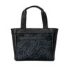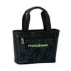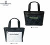チェーンのように絡み合ったバニーがプリントされた厚手のツイル生地とレザーライクな合皮生地の組み合わせ。収納力に優れた横型ラウンドトートバッグ。ポケットは外2、内2