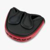 「Square 2 Square TRI-HOTパター」は、ゼロトルクパターとなっていますが、シャフトはフェース面に非常に近い場所に装着され、従来のゼロトルクパターのように飛球線方向に傾けられていないところが最大の特徴です。これらにより違和感なくアドレスでき、パッティングに臨むことができますし、一般的なパターからもよりスイッチしやすくなっていると言えます。3つの複合素材を使ったプレミアムな構造により、フェース面に近い装着位置を可能にフェース面に近い位置で、飛球線方向に傾けずにシャフトを装着できている最大の理由は、3種類のヘッド素材の配置にあります。ヘッド後方の赤い部分はアルミ、ホーゼルが装着されている黒い部分はステンレス、そしてインサートの周囲やソール前方に見えるグレーの部分はタングステンで、赤いアルミのソール側には、重量を減らすべく大きな窪みも開けられています。これらにより、「Square 2 Square TRI-HOTパター」は、ヘッドの約80%の重さをフェース側に集中させることで、従来のゼロトルクパターよりも、極限まで浅重心化を追求し、シャフト装着部分をよりフェースに近づけることでゼロトルクを実現。シャフト装着位置からフェース面が大きく前方に張り出していないため、シャフトを飛球線方向に傾ける必要もなくなりました。