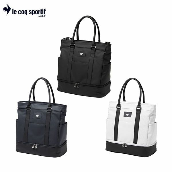 二層式のトート型ボストンバッグ。ルコックスポルティフゴルフの定番商品で、多くの支持を受けているロングセラーアイテムがアップデート。バッグ本体の両サイドには、多くのお客様から要望を頂いていたポケットを追加。スマートフォンやペットボトルなど、簡易的に収納できるスペースがプラスオン。下部ポケットはシューズを収納するために大きく開閉。本体は、合成皮革素材にパンチング加工を施し、細かい穴が開いた表面感が特徴。ショルダー付属。