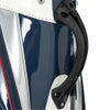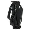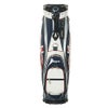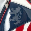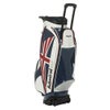 キャスター付きのキャディバッグ。エナメル生地を使用。大きいユニオンジャッグがデザインポイント。キャスター付きとなっており、背面にはキャリーハンドルがある為、運ぶ際も簡単。キャリーハンドルも使用する際、手に干渉しにくいようにハンドルがカーブしている設計となっている。口枠9型5分割、セパレーター3分割。