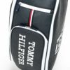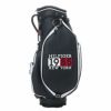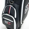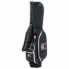 レザー調PU生地を使ったキャディバック。サイド面の印象的なロゴワークは、刺繍とアップリケで表現され高級感がある。背面も刺繍で表現したブランドロゴとシグネチャーテープでどこから見ても映えるキャディバッグ。 口枠は5つに仕切られており仕切り布付き。クラブ出し入れ時のグリップの絡まりを防止できる。