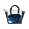 エナメルスポーツシリーズのラウンドバッグ。スマートなデザインでエナメルの光沢感が特徴。今シーズンのテーマを取り入れ、縦横のラインで都会的な印象を演出。天マチ付きのファスナー開口。正面にはファスナーポケット。内装にもファスナーポケット付き。