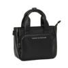 ユースフルシリーズのラウンドバッグ。ソフトで高級感のある合皮を使用し、上品な仕上がり。シリーズ共通のテープがデザインポイント。天マチ付きのファスナー開口。正面にはファスナーポケット。内装にも仕切りポケット付き。