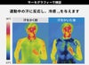 冷感性能 実証実験真夏の環境を再現し検証しました。室内温度36.4℃、湿度54%の環境で36℃に設定した疑似的皮膚表面に、水で濡らした生地を置き、サーモグラフィカメラで温度変化を撮影。