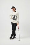 前身頃からはみ出すほどのビッグサイズロゴを配置したジャカードセーター。