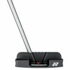 ヘッドのグレーゾーンの外周(オレンジの線)をカップの大きさ(直径108mm)、内周(黄色の線)を確実にカップインする許容円の大きさ(直径60mm)とすることで、カップインをイメージしながら、安心してストロークできるようにデザイン。さらに「カップまで1mの距離をスクエアにインパクトする場合、0°~5.61°の範囲内でストロークすればカップインする」というトライプリンシプル理論から、赤いガイドラインで5.61°の許容角を示し、ストローク時の目安になるように設計しています。